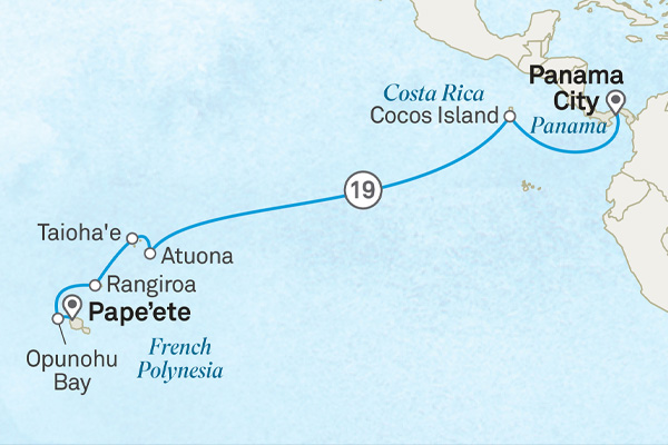 Experience a luxurious and languid transpacific journey over 19 nights. This ocean crossing journey starts in Papeete, the capital of Tahiti, with paradisical stops in French Polynesia, ending in Central America’s Panama City, home to one of the world’s greatest engineering feats, the Panama Canal.