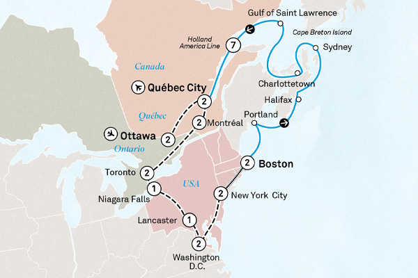 A journey across borders, cultures and time, this 24 day journey combines the elegance of Eastern Canada with the vibrancy of the most iconic US cities. Experience the rich histories, diverse people and spectacular sights of this storied North American coastline.
