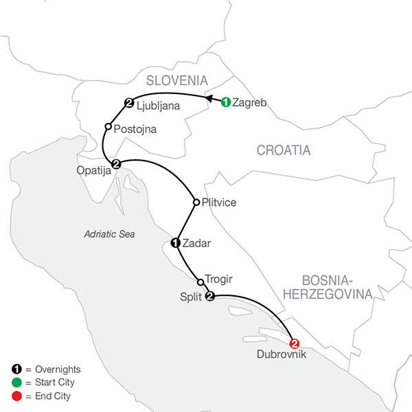 Spend 2 nights in Dubrovnik, go underground on a tour of Slovenia's Postojna Caves and explore the UNESCO-listed Plitvice National Park.