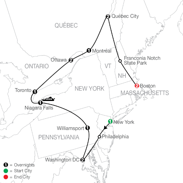 See Washington D.C.'s iconic landmarks on a guided tour, cruise beneath the mist of thundering Niagara Falls and get a taste of France with a special dinner in Quebec.