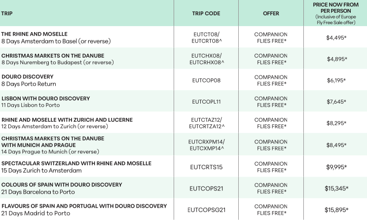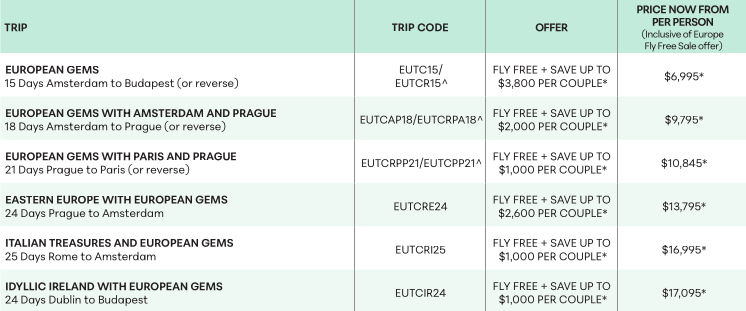 *Conditions apply. See: Travelmarvel website, search tour code and view tour for full conditions. Book by 4 March 2026, unless sold out prior. FLY FREE: Offer available on European Gems and variation tours departing in 2026 and 2027 (Trip Codes: EUTCR15, EUTC15, EUTCRPP21, EUTCPP21, EUTCAP18, EUTCRPA18, EUTCPB18, EUTCRBP18, EUTCRE24, EUTCRI25, and EUTCIR24). COMPANION FLIES FREE: Offer available on select Travelmarvel tours departing in 2026 and 2027 (Trip Codes: EUTCHX08, EUTCRHX08, EUTCT08, EUTCRT08, EUTCOP08, EUTCRXPM14, EUTCXMP14, EUTCOPL11,EUTCTAZ12, EUTCRTZA12, EUTCOPS21, EUTCOPSG21, EUTCRTS15, EUTCLAZ12, and EUTCRLZA12). Prices based on EUTC15: 17 November 2026, EUTCAP18: 23 November 2026, EUTCRPP21: 6 November 2026, EUTCRE24: 3 October 2026, EUTCRI25: 10 July 2026, EUTCIR24: 11 July 2026, EUTCT08: 28 July 2026, EUTCHX08: 8 December 2026, EUTCOP08: 13 August 2026, EUTCOPL11: 3 August 2026, EUTCTAZ12: 17 July 2026, EUTCRXPM14: 28 November 2026, EUTCRTS15: 28 July 2026, EUTCOPS21: 7 August 2026, and EUTCOPSG21: 19 June 2026. FLIGHTS: Flights are available from Sydney, Melbourne, Adelaide, Brisbane, Darwin or Perth and must be booked by Travelmarvel/The APT Travel Group. All airfares are based on economy class with Qatar Airways and are subject to availability. The Fly Free and Companion Flies Free offers include airfare and taxes up to $2,700 per person. If the total exceeds this, a surcharge will apply. Frequent flyer points may not be available on all fares. DEPOSITS: A non-refundable deposit of $3,000 per person on 2026 departure bookings and $1,000 per person on 2027 departure bookings is due within seven days of booking followed by a second non-refundable deposit of $2,000 per person is due by 31 October 2026. Changes after ticketing may incur fees. Combinable with bonus saving and EPD offers. Advertised offers on Travelmarvel website include the Fly Free Europe Sale offers. Offers are valid for new bookings only, subject to availability and may be withdrawn at any time. Offers are not combinable with Distress Offer, Hot Deals, VIP Agent Deals or any other exclusive/campaign offers. ^Indicates tour operates in reverse direction.