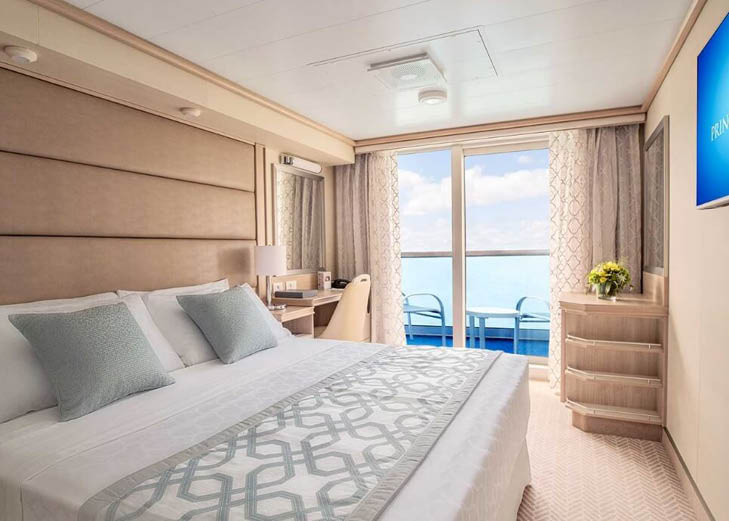Choose one of the formidable Balcony cabins on board Enchanted Princess®, and you can enjoy the indulgence of a balcony, as well as more space than an Interior or Premium Oceanview room. Enjoy a private outdoor space of your own, complete with a table, two chairs, and a true “front-row” view of the sea.